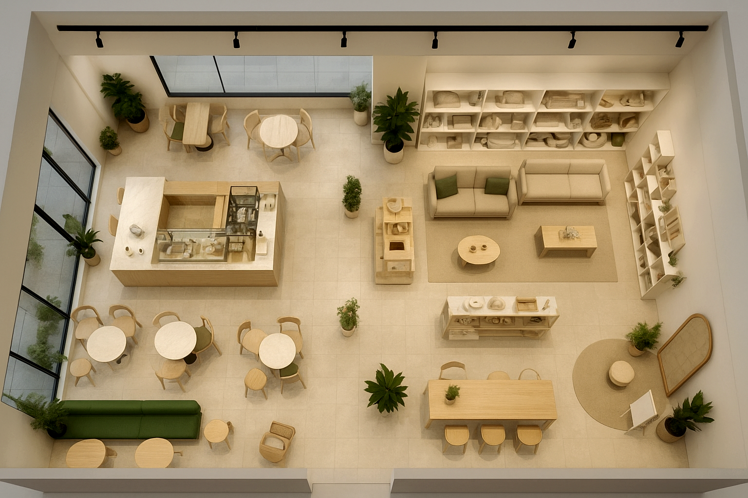 - 전면 창가 쪽 → 밝고 개방감 있는 카페 테이블·소파 배치